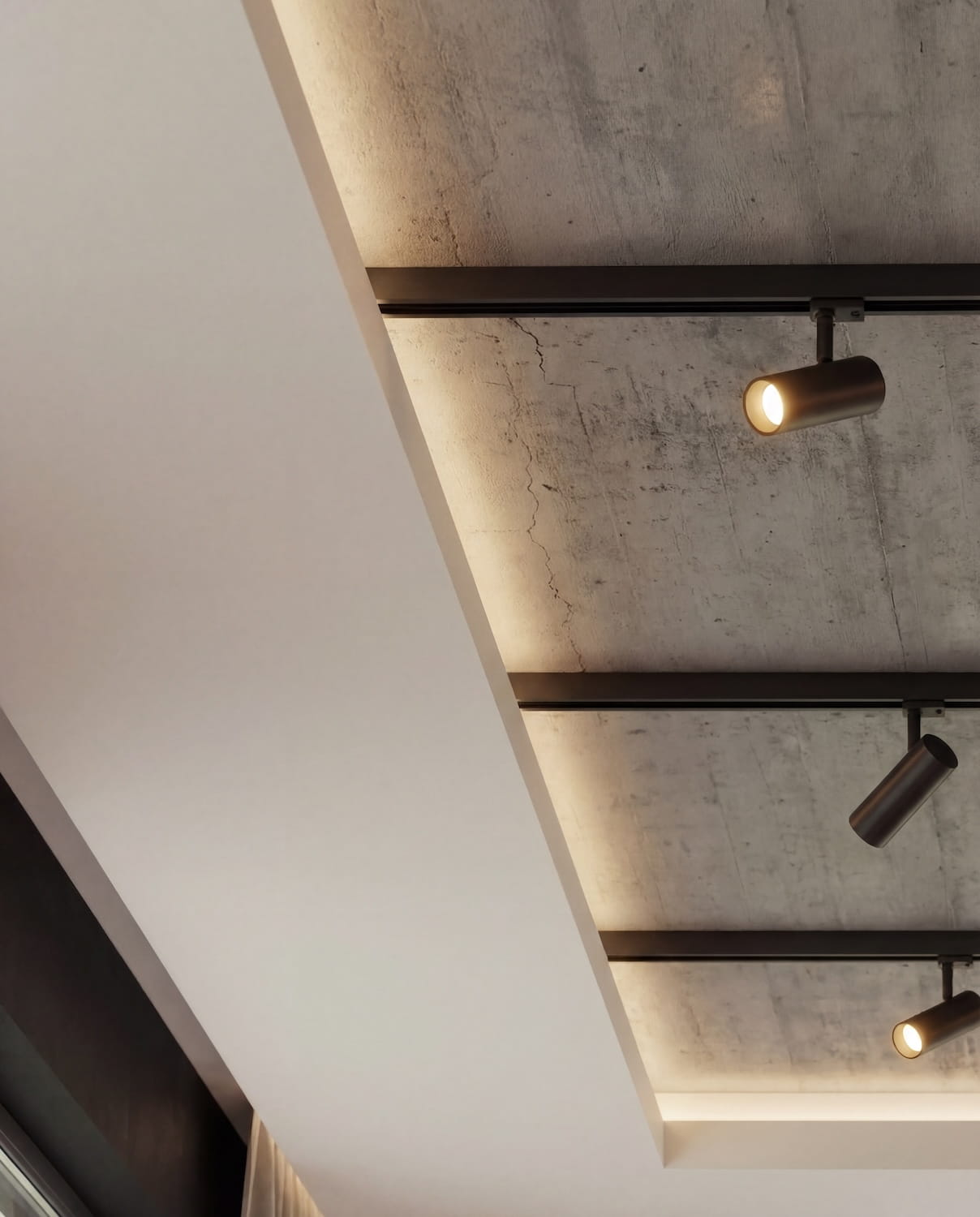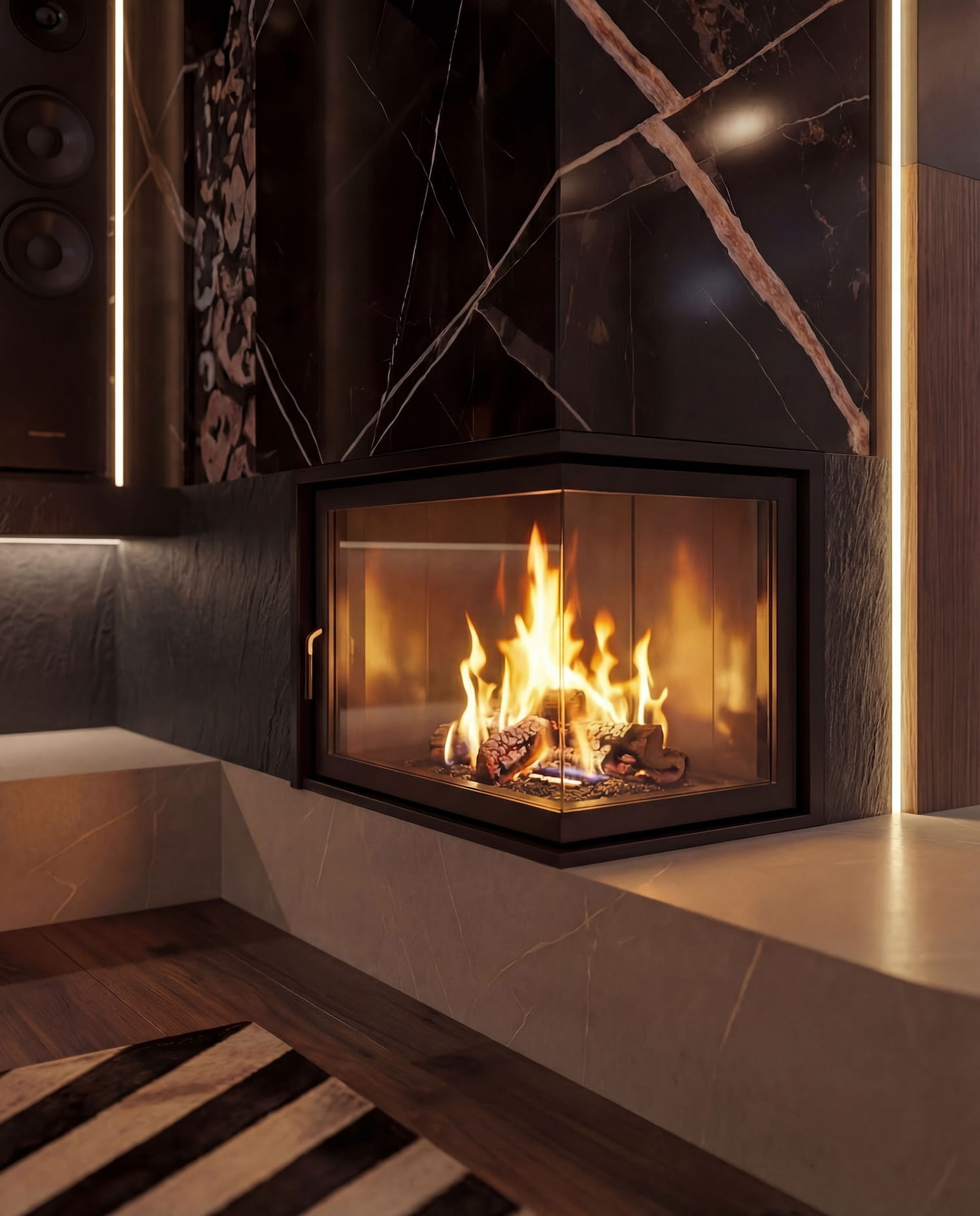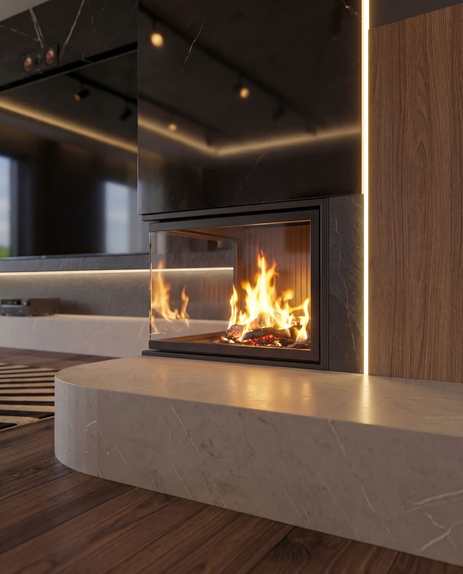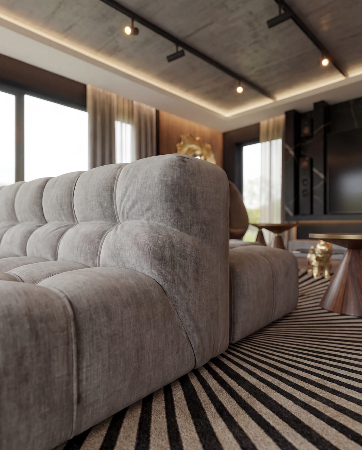 Strefa wypoczynkowa została zbudowana wokół wyrazistej ściany telewizyjnej zintegrowanej z systemem audio i kominkiem narożnym. To właśnie ona porządkuje przestrzeń salonu i nadaje jej mocny, nowoczesny charakter. Ciemna zabudowa zestawiona ze spiekami, światłem i ogniem tworzy eleganckie tło dla codziennego życia, ale nie przytłacza wnętrza. Całość została zrównoważona miękką, modułową sofą, geometrycznym dywanem i starannie dobranymi stolikami kawowymi, dzięki czemu salon zachowuje zarówno reprezentacyjność, jak i domowy komfort. To przestrzeń, która sprzyja odpoczynkowi, wspólnemu spędzaniu czasu i wyciszeniu po intensywnym dniu.