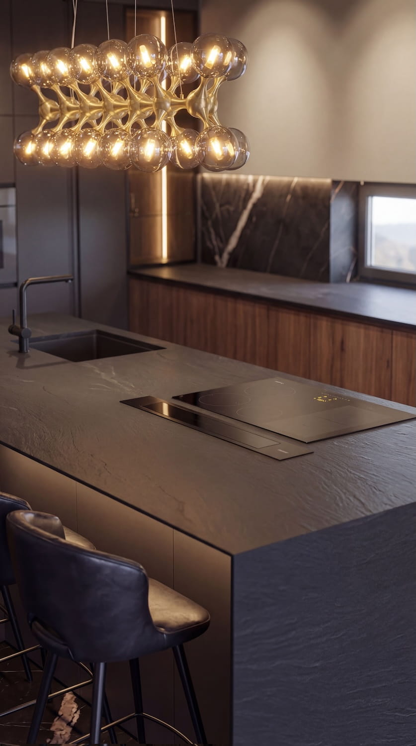 Projekt kuchni premium – ciemna zabudowa, wyspa i naturalne materiały