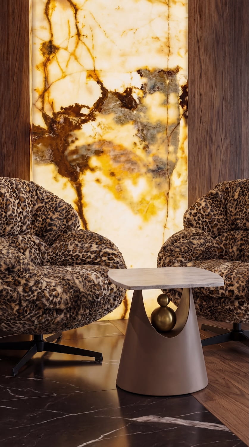 Kuchnia została zaprojektowana jako mocna, elegancka część strefy dziennej, ale bez utraty funkcjonalności. Jej centralnym elementem jest duża wyspa wykończona spiekiem Laminam Ardesia Nero, która organizuje układ całej przestrzeni i naturalnie łączy kuchnię z salonem oraz jadalnią. W zestawieniu z ciemną zabudową, drewnianymi frontami i dopracowanym oświetleniem architektonicznym powstała kompozycja nowoczesna, szlachetna i bardzo spójna. Posadzka ze spieku Calacatta Black marki Coverlam by Grespania podkreśla luksusowy charakter tej części wnętrza, a światło wydobywa głębię materiałów i buduje atmosferę. To kuchnia, która nie jest wyłącznie strefą roboczą — staje się integralną częścią reprezentacyjnego wnętrza domu.
