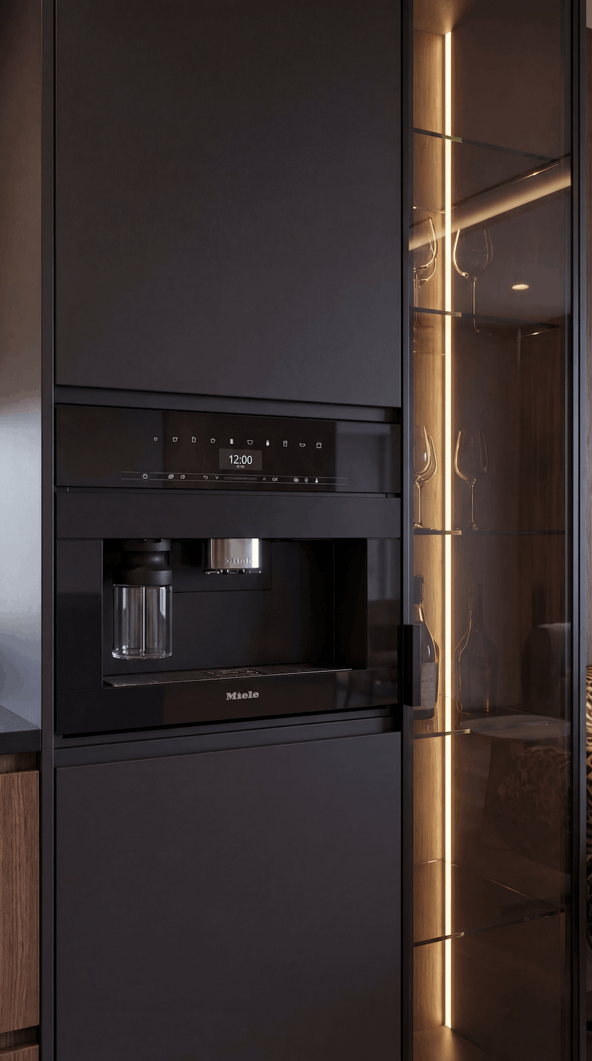 W projekcie tej strefy bardzo ważne było zachowanie eleganckiej równowagi. Zabudowa łączy ciepłe drewno, ciemne fronty, subtelne frezowania oraz zintegrowane linie LED, które podkreślają pionowe podziały i nadają całości lekkości. Po jednej stronie pojawia się ekspozycja alkoholi w formie nowoczesnej, podświetlanej witryny, po drugiej — barek wpisany w zabudowę. Całość jest dopracowana w taki sposób, aby tworzyć efekt luksusowy, ale nieprzerysowany.