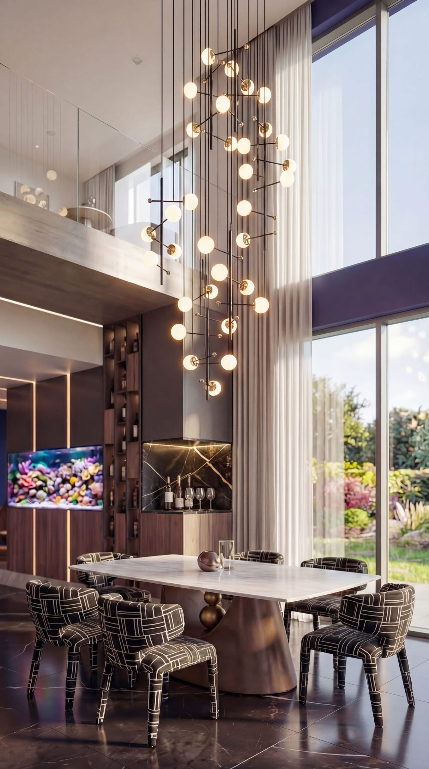 Nowoczesna jadalnia z akwarium w zabudowie i strefą barku
